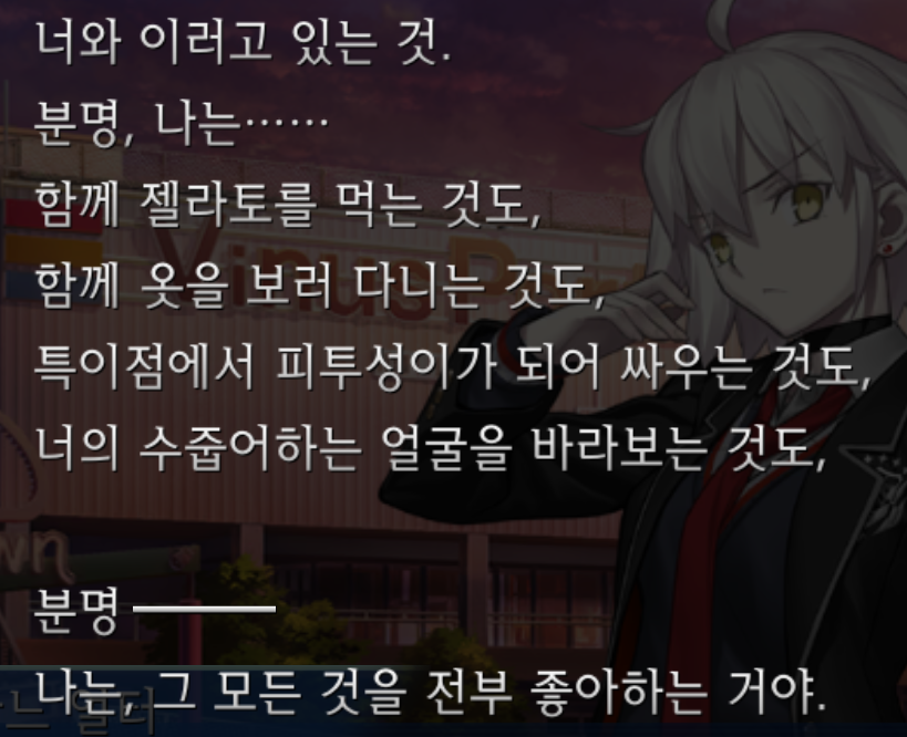 이 즈음에 하루하루 자기도 죽어가는 듯이 지내면서 끼니도 거르고... 자길 걱정해주는 서번트(흑잔)를 포함해서 모두에게 쌀쌀맞고 어색하게 굴고...